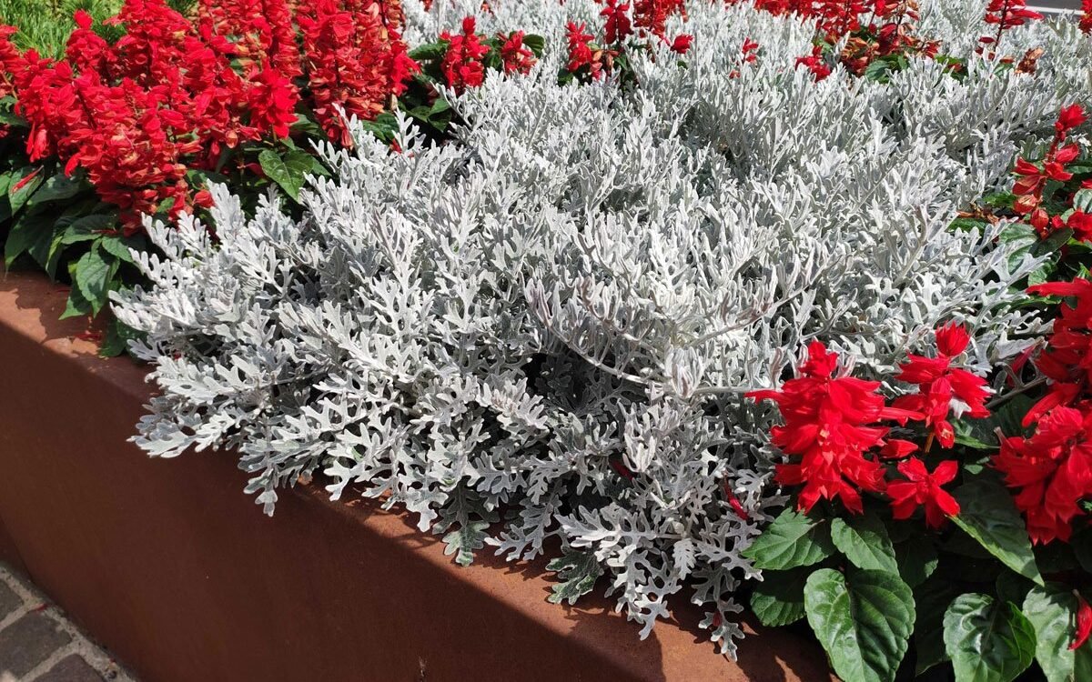 Gli accostamenti cromatici possono prevedere sfumature della stessa tonalità o un’alternanza scegliendo anche tra le diverse varietà disponibili appartenenti alla medesima specie. È quindi possibile usare piante con infiorescenze dalle differenti gradazioni dello stesso colore o dalle nuance contrastanti ma visivamente armoniose come ad esempio per Salvia farinacea Blu le cui infiorescenze a spiga dalle caratteristiche tonalità bluastre ben si combinano con i fiori di differenti varietà di Begonia semperflorens, Lobularia maritima e Tagetes patula; possiamo ottenere risultati eleganti accostando anche piante con foglie colorate o variegate come i numerosi ibridi di Solenostemon coleoides o di Coleus blumei. Notevoli effetti scenografici si ottengono con erbacee dal fogliame denso e monocolore che forniranno un supporto perfetto per far risaltare i fiori colorati di altre ornamentali che sembreranno fluttuare nell’aria con un risultato d’insieme ben bilanciato come per Ipomea x hybridale cui foglie possono fare da cornice o sfondo a specie quali Impatiens x hybrida Nuova Guinea e Lobularia x hybrida, oppure Heuchera americana con Cuphea hyssopifolia. Affascinante anche l’accostamento di Senecio cineraria Silver dalle foglie argentate, perfette per far risaltare i toni caldi o le tinte pastello dei fiori delle varietà di Begonia x hybrida, Begonia semperflorens, Verbena x hybrida e Zinnia marylandica.